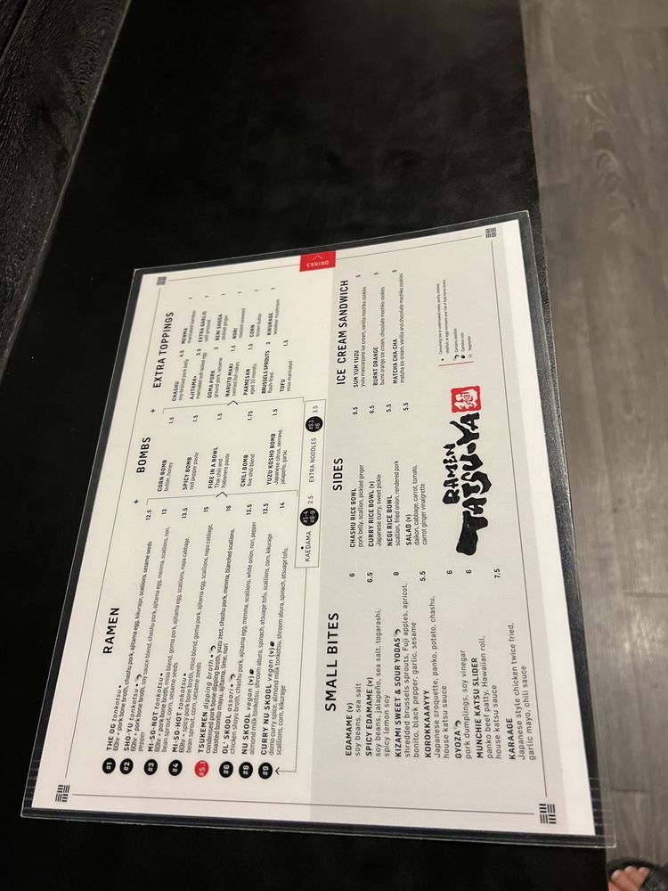 Pork Bone Broth, Soy Sauce Blend, Chashu Pork, Ajitama Egg, Menma, Scallion, Nori, Pepper*Contains Egg , Shellfish "Consuming raw or undercooked meats, poultry, seafood, shellfish, or eggs mayincrease your risk for foodborne illness"*Consuming raw or undercooked meats, poultry, seafood, shellfish, or eggs may increase your risk of foodborne illness.